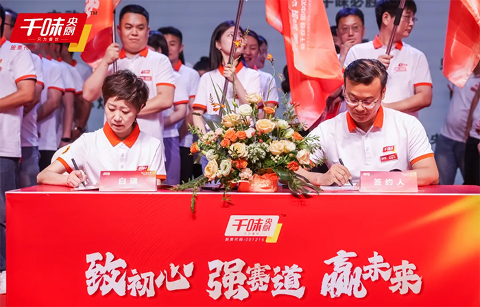 接下來營銷會議的重頭戲隆重登場,千味央廚各團(tuán)隊(duì)揮動隊(duì)旗喊出口號,進(jìn)行了一場震撼人心的誓師大會,一展優(yōu)秀團(tuán)隊(duì)風(fēng)采。全體銷售人員滿懷激情,乘勢而上立下軍令狀,向2024新財(cái)年目標(biāo)邁進(jìn)!